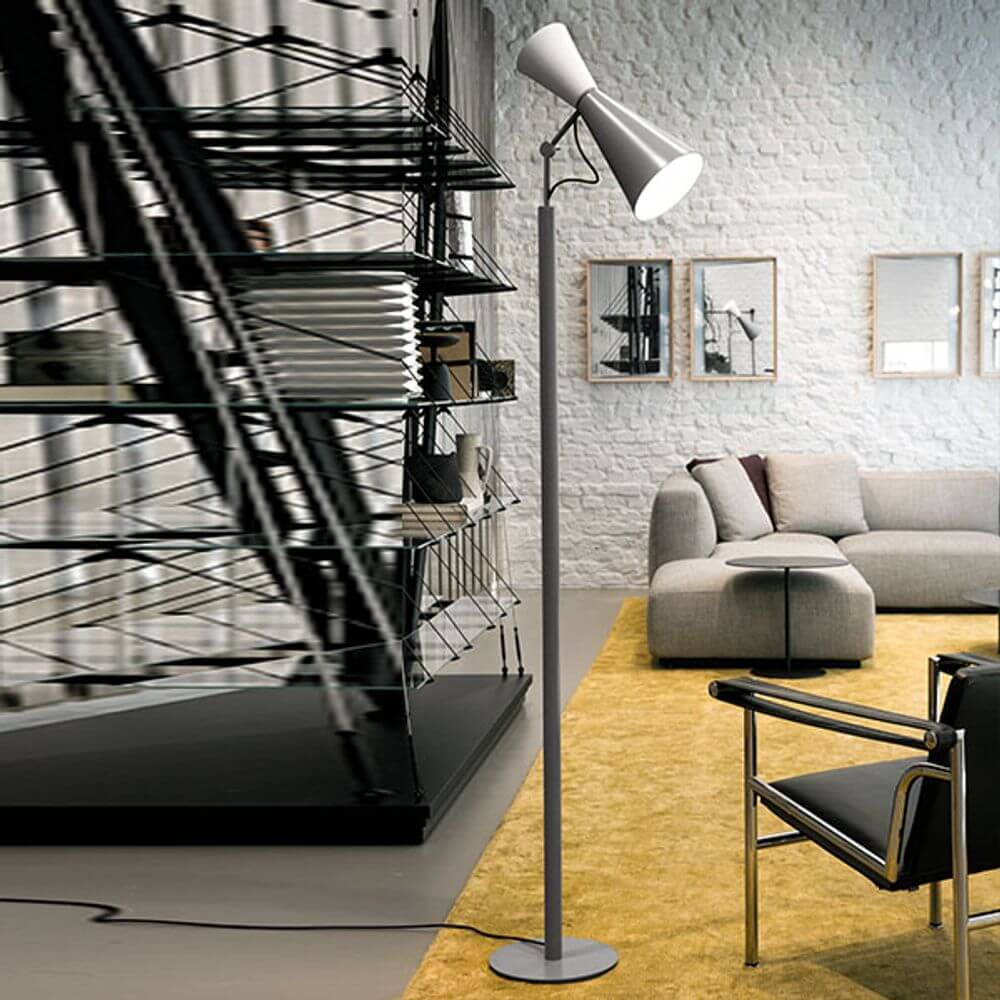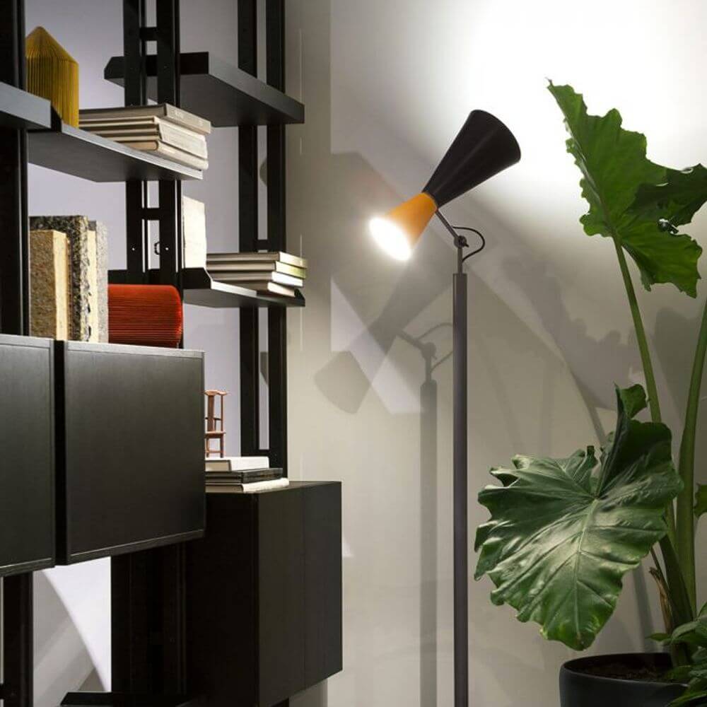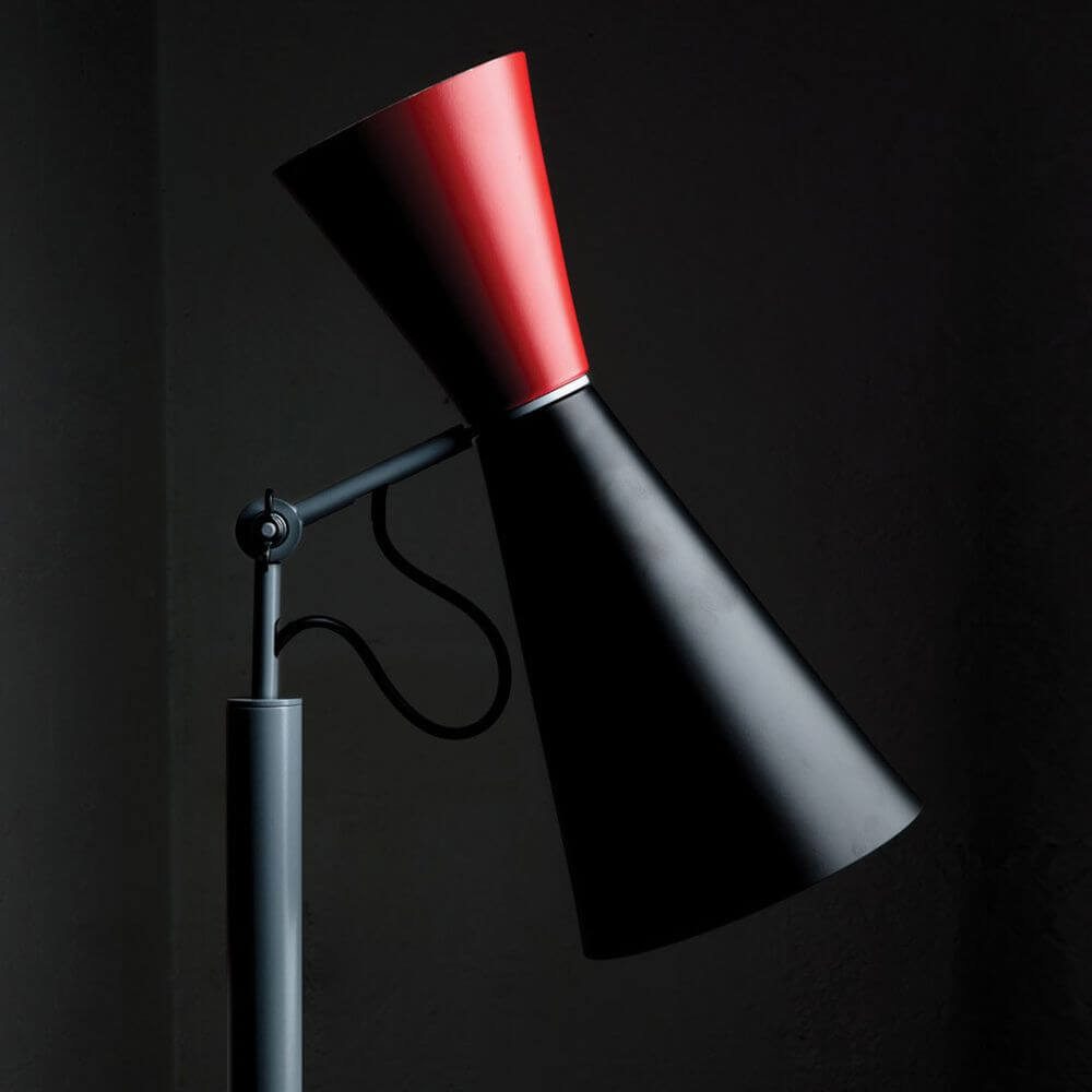 The parliament was designed by Le Corbusier for Chandigarh Parliament in India. Standing lamp oriented and with double light exit, made of painted aluminum with diffusers in matt black and yellow, matt black and gray and matt black and red in the new version. Defusors inside white, shaft in matt gray. Creates indirect and direct light in the room.