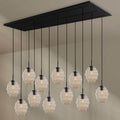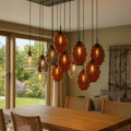 The s.luce Echos 12-light dining room lamp with 160 cm canopy is an elegant, 2-row pendant luminaire for stylish lighting scenarios above longer dining tables or in open-plan living areas. Twelve hand-blown glass bodies with a diameter of 18 cm and a textured surface are reminiscent of the undulating movement of an echo - lively, harmonious and unique. Combined in the colors brown (cognac), smoke and clear, the result is an atmospheric luminaire with an individual radiance.