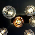 Five hand-blown glasses with a textured surface create a lively interplay of light and shadow. The choice of shades in brown (cognac), smoke or clear allows the luminaire to be individually adapted to the room style - whether tone on tone or in deliberate contrast.
