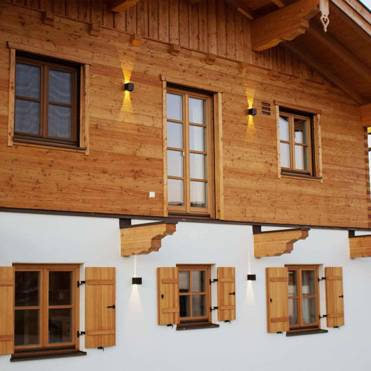 Diese eleganten Wandleuchten sorgen für angenehmes Licht und eine stilvolle Fernwirkung. Ihr zeitloses Design ergänzt die Fassade modern und einladend für den Außenbereich.
