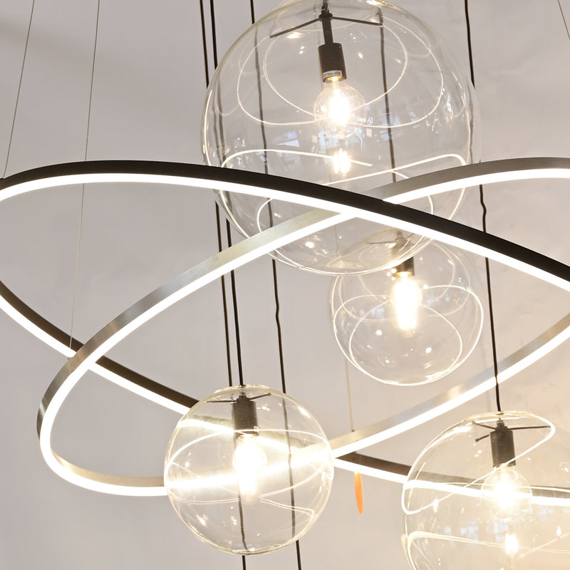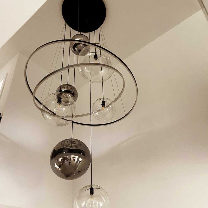 Sim, o s.luce A Galaxy pode ser personalizada a pedido. O utilizador decide a altura, o alinhamento e a posição dos anéis e/ou esferas de vidro - para um design de iluminação ao seu gosto.