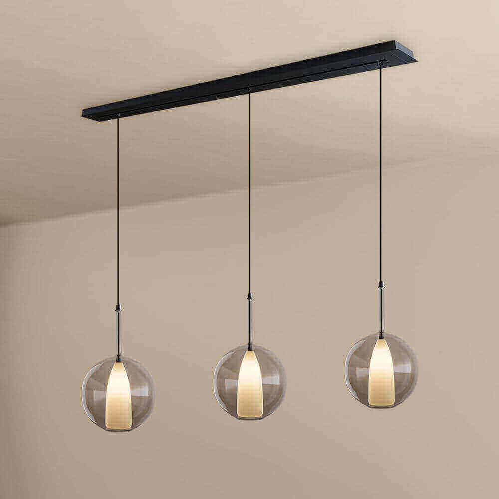 Com um comprimento de cabo de 150 cm essa luminária é ideal para alturas de teto padrão até cerca de 320 cm. Os pendentes são suspensos simetricamente num suporte estreito e discreto cobertura metálica ideal para uma disposição linear por cima de mesas. Dois tamanhos de vidro (Ø 14 cm & Ø 24 cm) estão disponíveis e podem ser combinados a pedido.