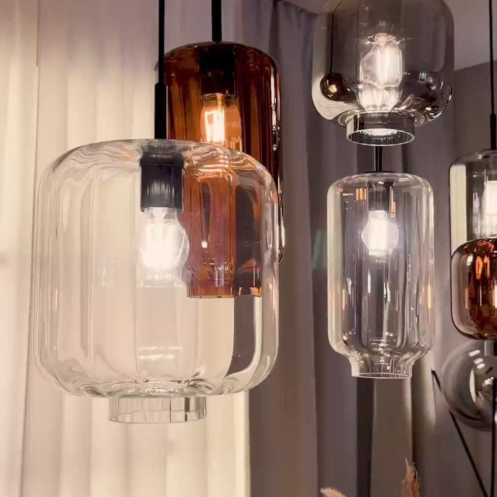 - Seleção variada: Em três cores elegantes (conhaque, transparente, fumado) e três tamanhos (Ø 25 cm, Ø 20 cm & Ø 18 cm), a luz pode ser perfeitamente adaptada ao conceito da sua divisão.