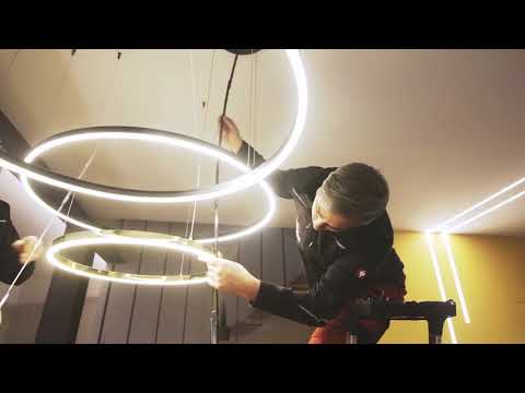 Det excentriska upphängningen ger å andra sidan armaturen ett asymmetriskt, något svävande utseende, eftersom kablarna är fästa på sidan av ringen. Detta gör att armaturen ser mer dynamisk ut och skapar ett spännande, modernt utseende. Denna upphängning ger möjlighet till kreativa designalternativ och är idealisk om flera ringar ska installeras på olika höjder för att skapa ett unikt ljusspel. Båda upphängningstyperna erbjuder därför en flexibel anpassning till olika rumskoncept.